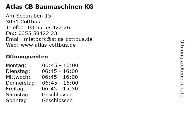| Öffnungszeiten Atlas CB Baumaschinen KG in Cottbus anzeigen | |