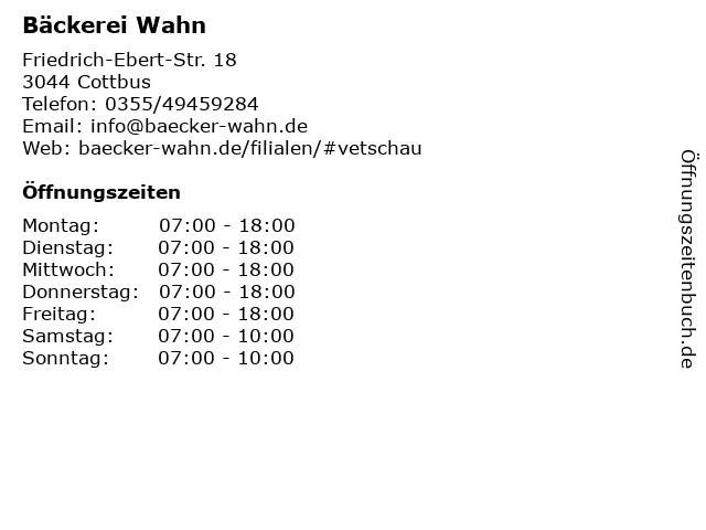 | Öffnungszeiten Bäcker Wahn in Cottbus anzeigen | |
