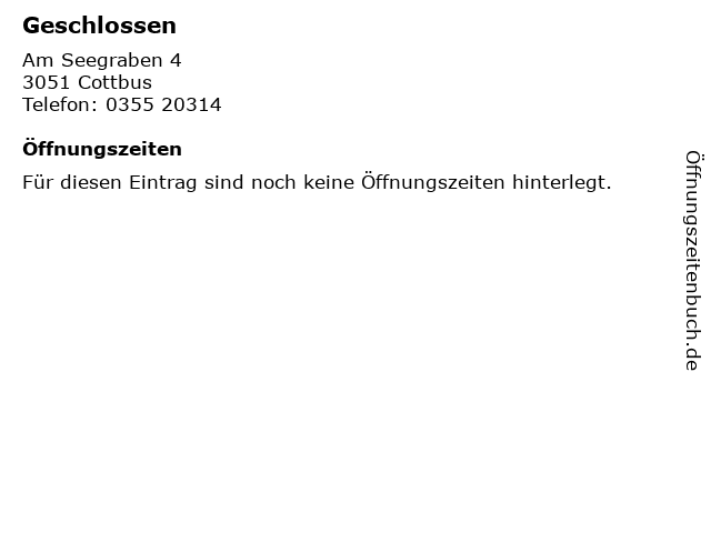 | Öffnungszeiten Geschlossen in Cottbus anzeigen | |