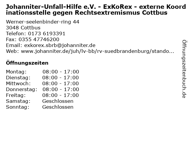Branchen & Suchbegriffe zu Johanniter-Unfall-Hilfe e.V. - ExKoRex - externe Koordinationsstelle gegen Rechtsextremismus Cottbus:e.v., exkorex, externe, gegen, gemeinnützige organisation, hilfe, hilfsorganisation, johanniter, koordinationsstelle, rechtsextremismus, unfall, verband, wohlfahrtseinrichtung |