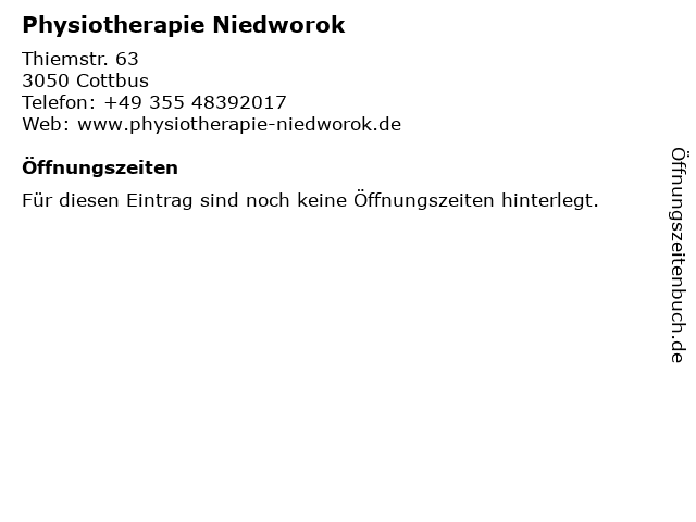 | Öffnungszeiten Physiotherapie Niedworok in Cottbus anzeigen | |