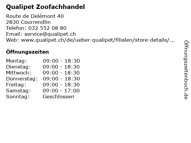 | Öffnungszeiten Qualipet Zoofachhandel in Courrendlin anzeigen | |