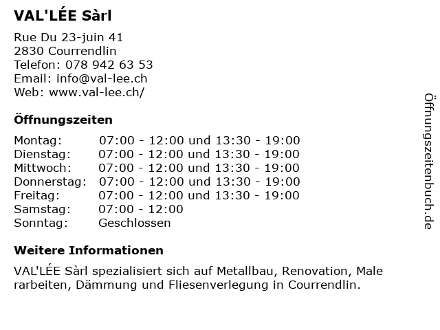 | Öffnungszeiten VAL'LÉE Sàrl in Courrendlin anzeigen | |