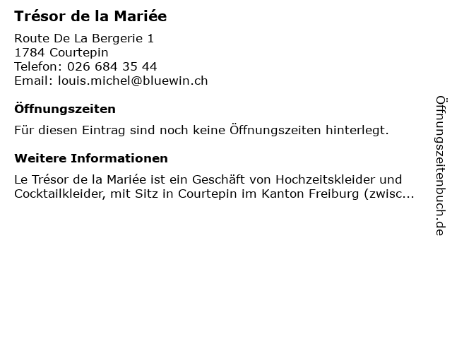 | Öffnungszeiten Trésor de la Mariée in Courtepin anzeigen | |