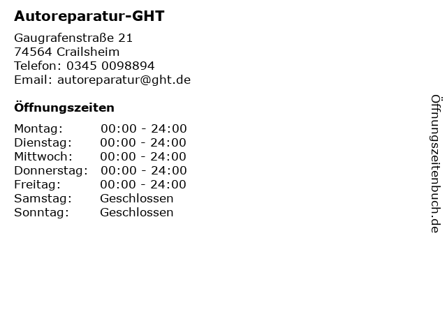 | Öffnungszeiten Autoreparatur-GHT in Crailsheim anzeigen | |