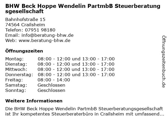 Branchen & Suchbegriffe zu BHW Beck Hoppe Wendelin PartmbB Steuerberatungsgesellschaft:beck, bhw, hoppe, partmbb, steuerberatungsgesellschaft, wendelin |