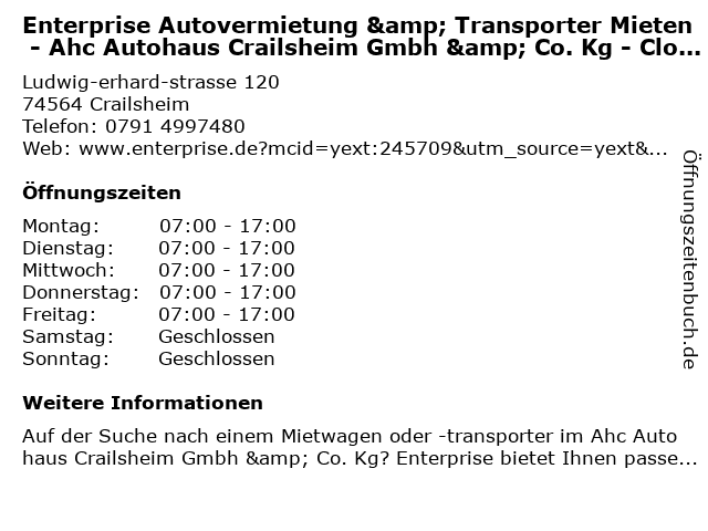 Branchen & Suchbegriffe zu Enterprise Autovermietung & Transporter Mieten - Ahc Autohaus Crailsheim Gmbh & Co. Kg - Closed:ahc, autohaus, autovermietung, closed, enterprise, mieten, transporter |