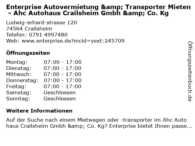 Branchen & Suchbegriffe zu Enterprise Autovermietung & Transporter Mieten - Ahc Autohaus Crailsheim Gmbh & Co. Kg:ahc, autohaus, autovermietung, enterprise, mieten, transporter |