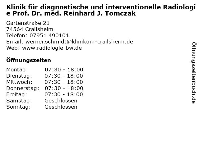 2 3 Prof. Dr. med. Reinhard J. Tomczak - Zentrum für diagnostische und interventionelle Radiologie (Entfernung: 2,55 km) Friedrichshaller Str 8-12, 74177 Bad Friedrichshall 6 |