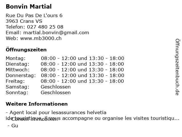| Öffnungszeiten Bonvin Martial in Crans VS anzeigen | |