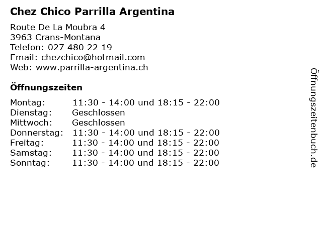 1 Parrilla Argentina Chez Chico - Restaurant argentin à Crans-Montana (Entfernung: 0,03 km) Route de la Moubra 2, 3963 Crans-Montana 6 |