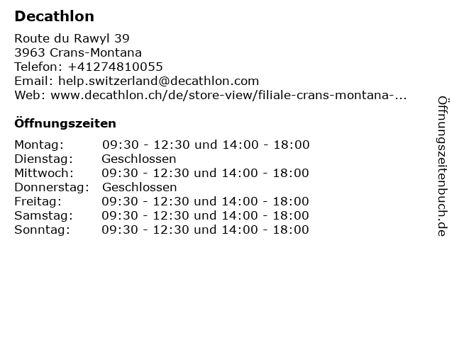 | Öffnungszeiten Decathlon in Crans-Montana anzeigen | |