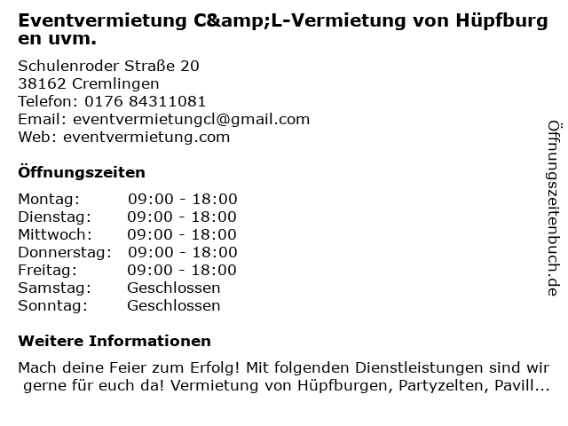 Branchen & Suchbegriffe zu Eventvermietung C&L-Vermietung von Hüpfburgen uvm.:c&l, eventvermietung, hüpfburgen, kinderpartyanbieter, uvm., vermietung, von, zeltverleih |