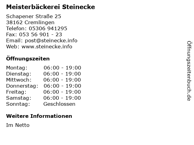 | Öffnungszeiten Meisterbäckerei Steinecke in Cremlingen anzeigen | |