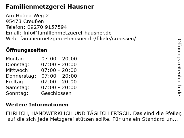 | Öffnungszeiten Familienmetzgerei Hausner in Creußen anzeigen | |
