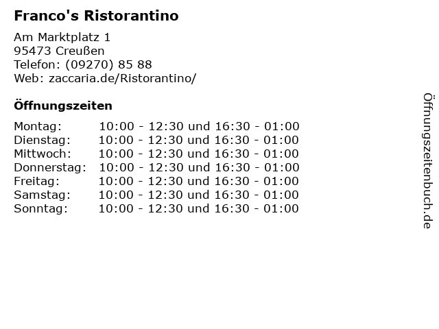 | Öffnungszeiten Franco's Ristorantino in Creußen anzeigen | |