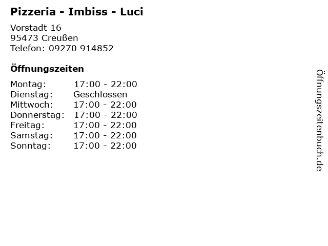 | Öffnungszeiten Pizzeria - Imbiss - Luci in Creußen anzeigen | |