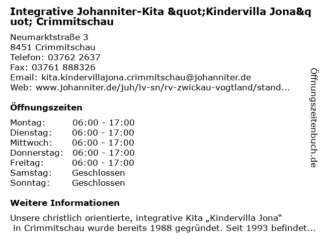 Branchen & Suchbegriffe zu Integrative Johanniter-Kita "Kindervilla Jona" Crimmitschau:"kindervilla, agentur für kinderbetreuung, gemeinnützige organisation, hilfsorganisation, integrative, johanniter, jona", kita, sozialarbeit, verband, wohlfahrtseinrichtung |