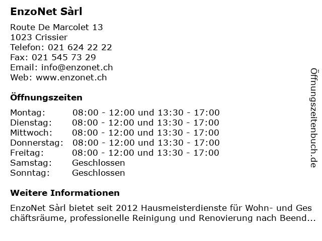 | Öffnungszeiten EnzoNet Sàrl in Crissier anzeigen | |