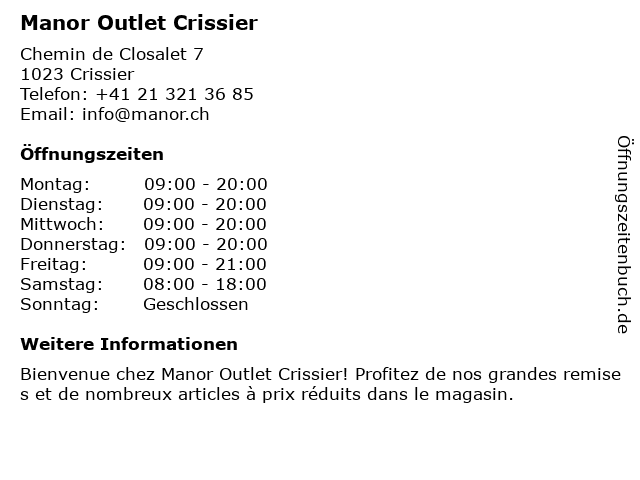 | Öffnungszeiten Manor Outlet Crissier in Crissier anzeigen | |