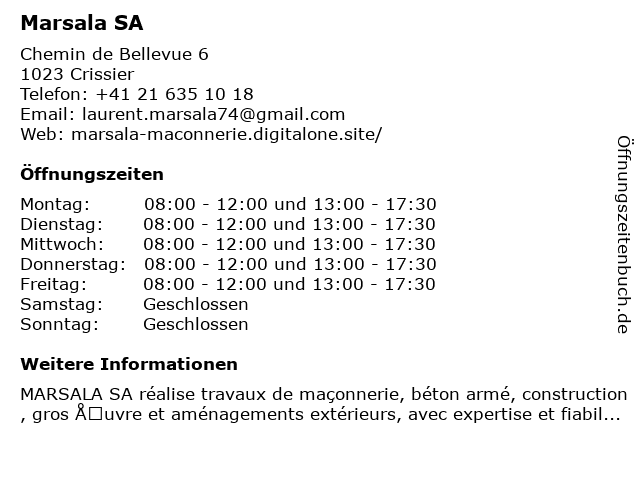 | Öffnungszeiten Marsala SA in Crissier anzeigen | |