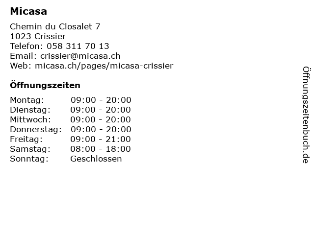 | Öffnungszeiten Micasa in Crissier anzeigen | |