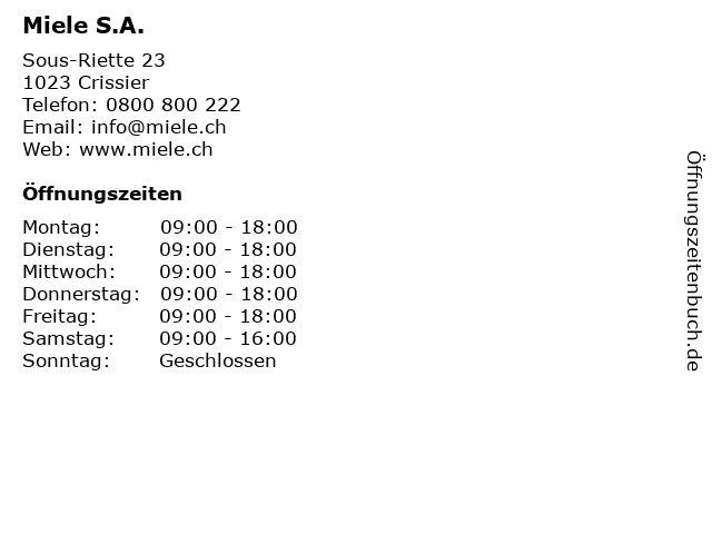 | Öffnungszeiten Miele S.A. in Crissier anzeigen | |
