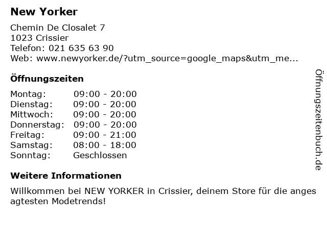 | Öffnungszeiten New Yorker in Crissier anzeigen | |