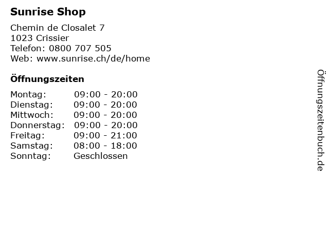 | Öffnungszeiten Sunrise Shop in Crissier anzeigen | |