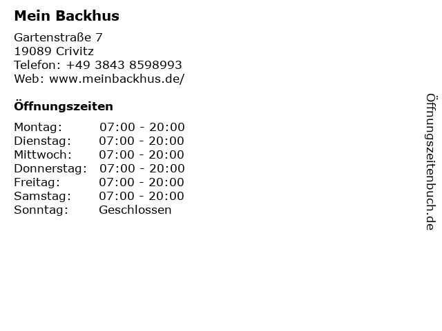 | Öffnungszeiten Mein Backhus in Crivitz anzeigen | |