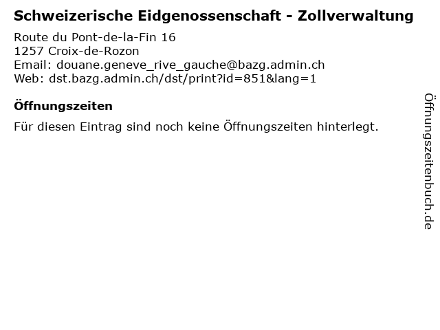 | Öffnungszeiten Schweizerische Eidgenossenschaft - Zollverwaltung in Croix-de-Rozon anzeigen | |