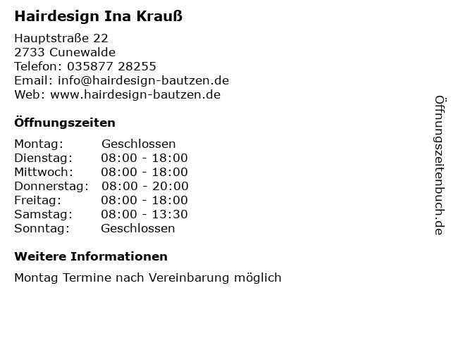 | Öffnungszeiten Hairdesign Ina Krauß in Cunewalde anzeigen | |