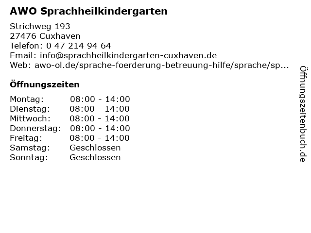 | Öffnungszeiten AWO Sprachheilkindergarten in Cuxhaven anzeigen | |
