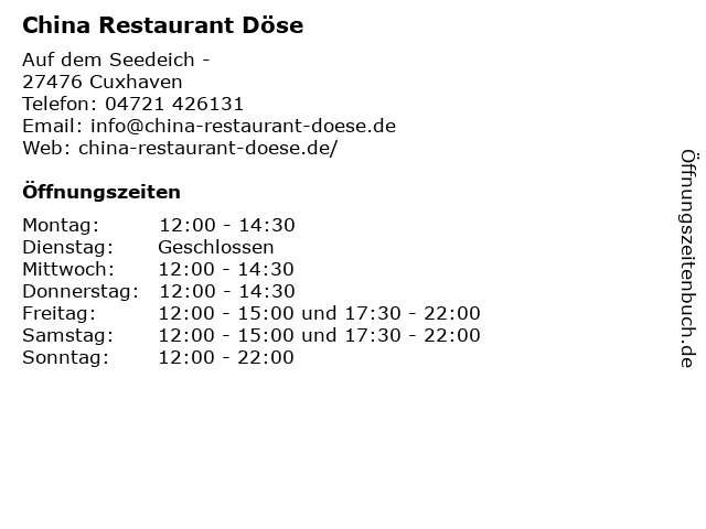 | Öffnungszeiten China Restaurant Döse in Cuxhaven anzeigen | |