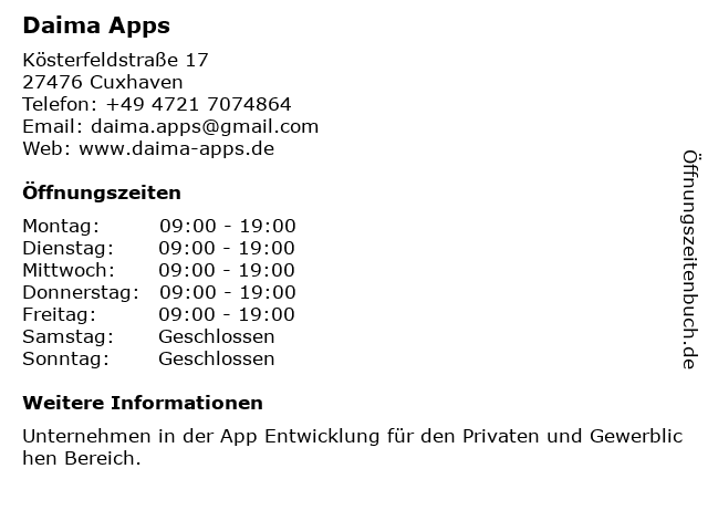 | Öffnungszeiten Daima Apps in Cuxhaven anzeigen | |