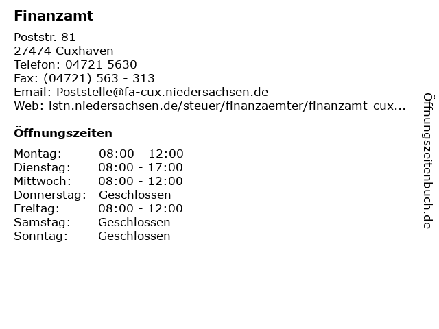 | Öffnungszeiten Finanzamt in Cuxhaven anzeigen | |