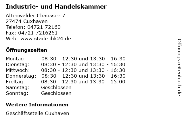 | Öffnungszeiten Industrie- und Handelskammer in Cuxhaven anzeigen | |