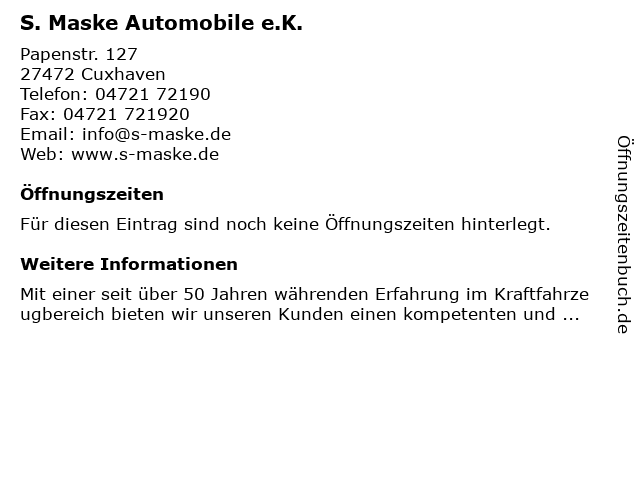 Öffnungszeiten S. Maske Automobile e.K.