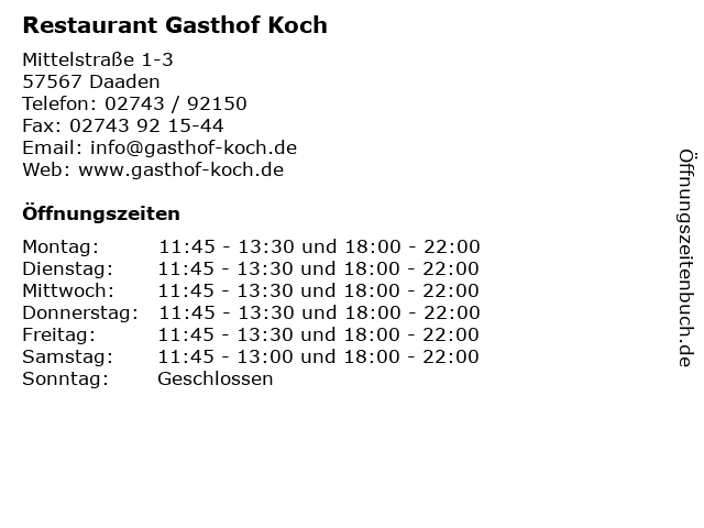| Öffnungszeiten Restaurant Gasthof Koch in Daaden anzeigen | |