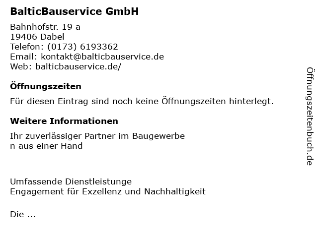 | Öffnungszeiten BalticBauservice GmbH in Dabel anzeigen | |