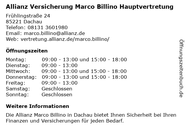 3 Allianz Versicherung Severin Deffner Hauptvertretung (Entfernung: 1,63 km) Emmy-noether-straße 2, 85221 Dachau 4 Allianz Versicherung Dominik Fischer Hauptvertretung (Entfernung: 2,55 km) Fraunhoferstraße 9, 85221 Dachau 6 |