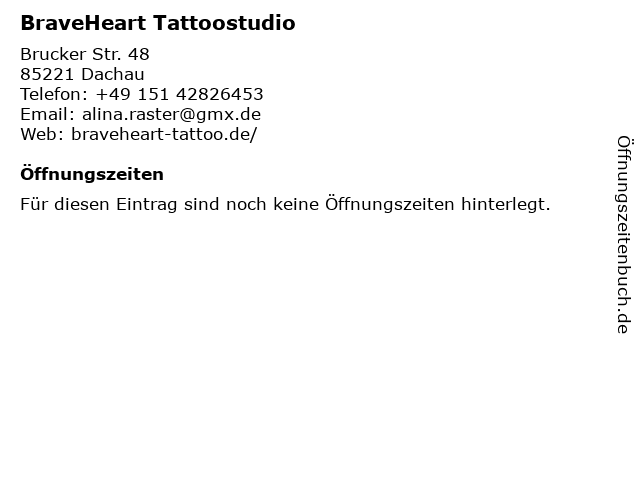 | Öffnungszeiten BraveHeart Tattoostudio in Dachau anzeigen | |