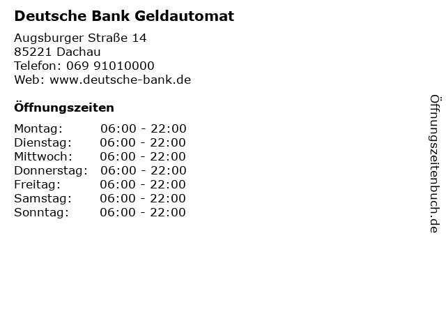 | Öffnungszeiten Deutsche Bank Geldautomat in Dachau anzeigen | |