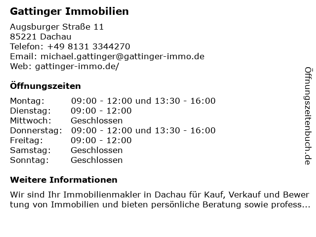 | Öffnungszeiten Gattinger Immobilien in Dachau anzeigen | |