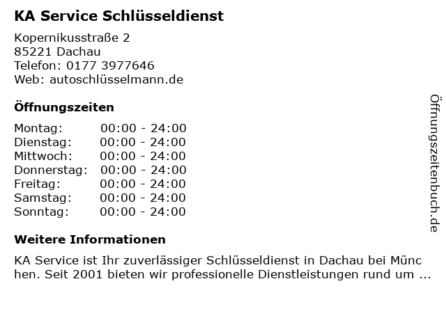 | Öffnungszeiten KA Service Schlüsseldienst in Dachau anzeigen | |