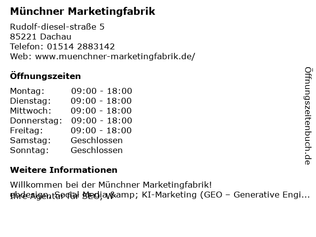 | Öffnungszeiten Münchner Marketingfabrik in Dachau anzeigen | |