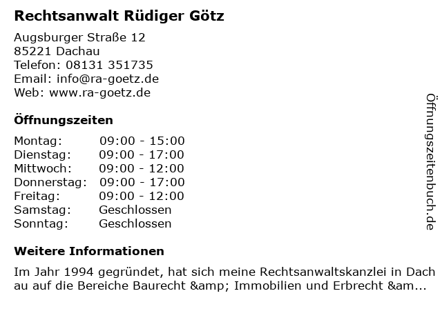 | Öffnungszeiten Rechtsanwalt Rüdiger Götz in Dachau anzeigen | |
