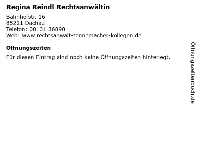 | Öffnungszeiten Regina Reindl Rechtsanwältin in Dachau anzeigen | |