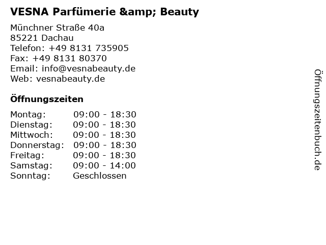 | Öffnungszeiten VESNA Parfümerie & Beauty in Dachau anzeigen | |