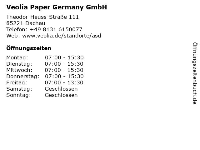| Öffnungszeiten Veolia Paper Germany GmbH in Dachau anzeigen | |